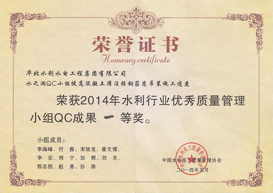 2014年水之澜QC小组成果一等奖