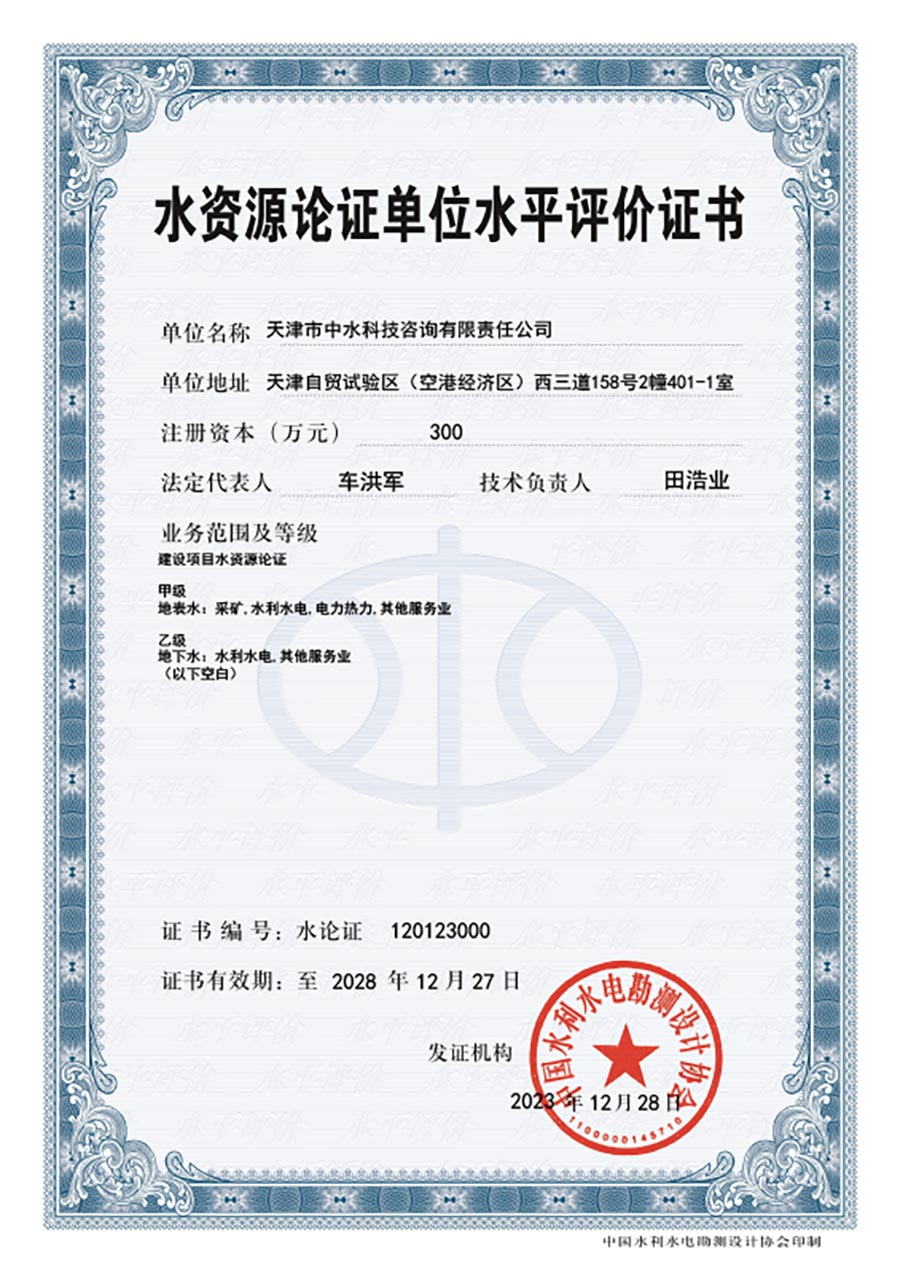 水资源论证单位水平评价证书 更新时间:2024-11-29 点击:134 所属栏目:企业资质 Update Time:2024-11-29 Hits:134 Belong Column:Qualification