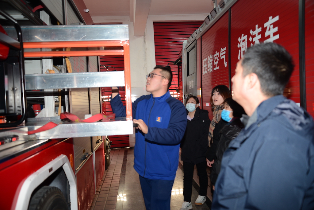 消防救援队工作人员热情地向职工介绍消防站内的各种消防车辆和消防装备的性能、消防隐患检查方法及灭火抢险救援情况等常识。