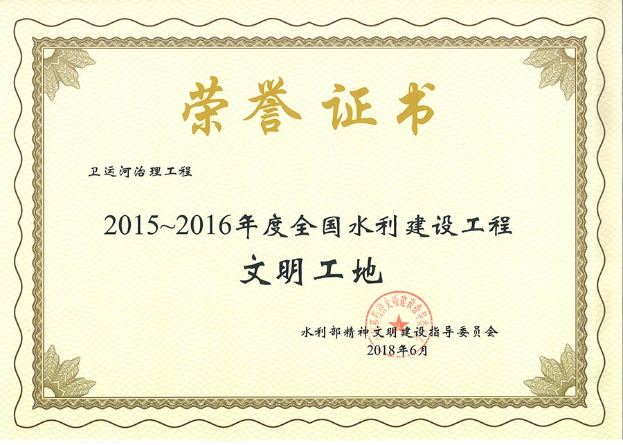 2015-2016年度全国水利建设工程文明工地 更新时间:2023-01-20 点击:2419 所属栏目:企业荣誉 Update Time:2023-01-20 Hits:2419 Belong Column:Honor