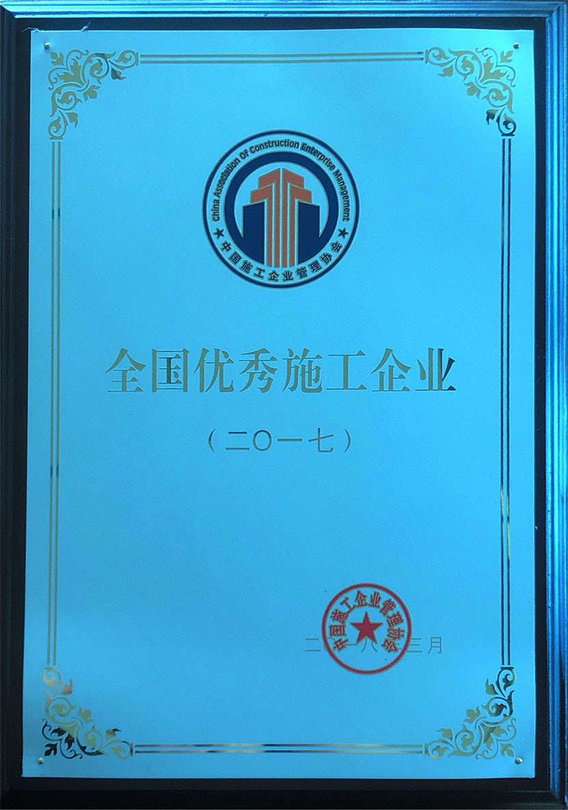 全国优秀施工企业(2017) 更新时间:2020-04-27 点击:5362 所属栏目:企业荣誉 Update Time:2020-04-27 Hits:5362 Belong Column:Honor