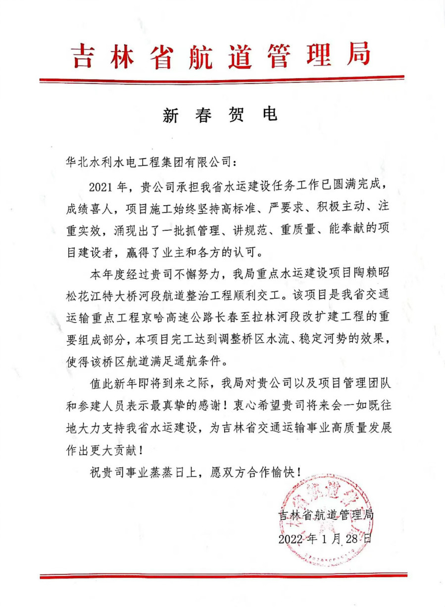 更新时间: 点击:9517 所属栏目:集团要闻 Update Time: Hits:9517 Belong Column:2022年1月28日,我司收到吉林省航道管理局新春贺电。在贺电中,管理局对我司完成的陶赖昭松花江特大桥河段航道整治工程提出高度表扬,并对我司以及本项目的管理团队及参建人员表示最真挚的感谢。
